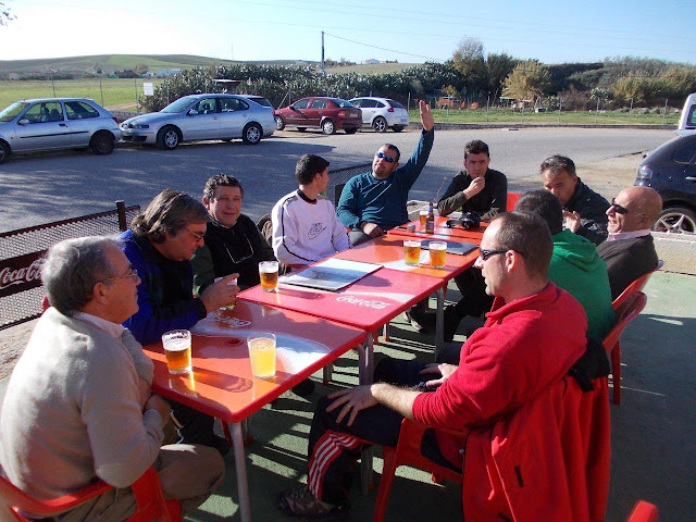 Bueno sigamos, la ruta en si discurrio por el corredor verde hasta Huevar donde se paro a repostar, una vez en camino de nuevo el siguiente punto fue la mina de las cruces y de hay hasta Guillena donde se paro a comer, aqui debemos hacer el inciso de que la comida se torno distendida y amena aparte de que algunos ya tenian el estomago algo vacio debido al camino algo "movidito, para los costeros" y claro necesitaban llenar la panza para entrar en calor despues de soltar lastre que buena falta hacia, resumen de la comida... muy bueno.